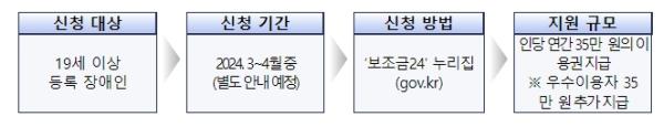 선정된 지자체는 지역 내 장애인*을 대상으로 보조금24(정부24 내) 누리집을 통해 평생교육이용권을 신청받는다. 지자체는 저소득층의 경제적 부담을 덜기 위해 기초생활수급자, 차상위계층을 우선 선정하며, 이용권 카드 미발급·미결제 등에 따른 예산 소진 정도를 고려하여 우수이용자(이용권 사용 현황, 강좌 출석·이수율 등 고려)에게 재충전(1인 연간 35만 원) 기회를 제공(하반기)한다.