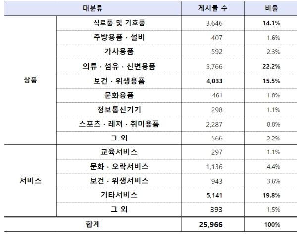 주요 법 위반 의심 게시물의 상품·서비스군은 의류·섬유·신변용품 중 간편복, 기타서비스 중 음식서비스, 보건·위생용품 중 화장품, 식료품 및 기호품 중 건강기능식품 분야에서 비중이 높은 것으로 나타났다.