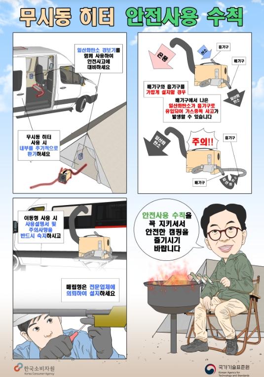 이에, 국표원, 소비자원, 한국제품안전관리원, 한국가스안전공사 및 한국관광공사는 ▲ 무시동 히터 흡기관과 배기관의 올바른 설치 방법, ▲ 사용 시 주기적인 내부 환기, ▲ 일산화탄소 경보기 설치를 통한 안전사고 예방 등 안전사용 수칙을 담은 홍보 포스터를 제작하여 인터넷 커뮤니티, 사회관계망서비스(SNS) 등을 통해 배포한다.