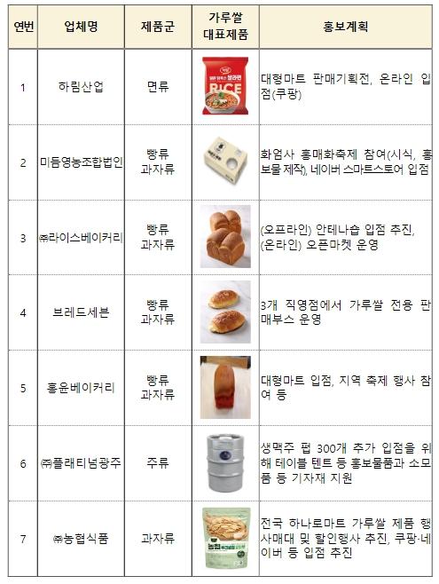가루쌀 라면을 출시했던 ㈜하림산업과 함께 미듬영농조합법인, 라이스베이커리, 브레드세븐, 홍윤베이커리, 플래티넘 맥주, 농협식품이 올해 판로지원사업의 사업대상자로 선정됐으며 판매 지원 예정인 가루쌀 제품은 면류(하림산업), 빵류(미듬영농조합법인, 라이스베이커리, 브레드세븐, 홍윤베이커리), 주류(플래티넘 맥주), 제과류(농협식품)이다. 향후 판로지원사업을 통해 각 제품의 판매기획전, 온·오프라인 광고, 실시간 방송판매(라이브 커머스) 제작·방영비, 온라인 판매 판촉 활동 등을 지원하여 소비자들에게 판매될 예정이다.
