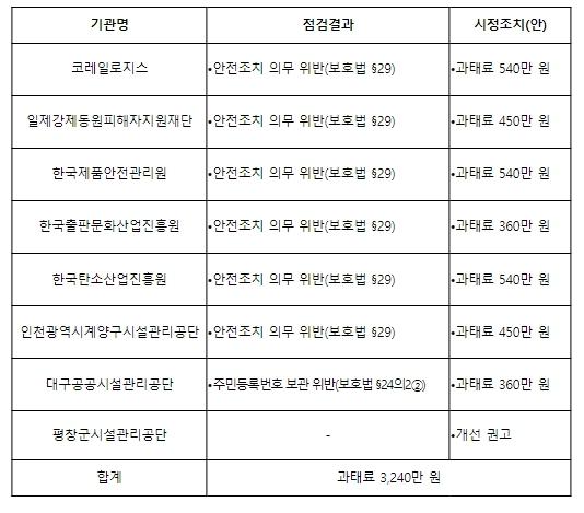 이번 실태점검은 공공기관의 개인정보 관리수준 진단의 실효성 확보를 위하여 진단에서 미흡 판정을 받은 기관에 대해 실시했고, 점검 결과 암호화 미조치, 접근통제 의무 위반, 접속기록 관리 위반 사실 등이 확인된 코레일로지스, 일제강제동원피해자지원재단, 한국제품안전관리원, 한국출판문화산업진흥원, 한국탄소산업진흥원, 인천광역시계양구시설관리공단, 대구공공시설관리공단의 7개 기관에 과태료를 부과하는 한편, 보호실태가 미흡한 평창군시설관리공단에 개선권고를 했다.