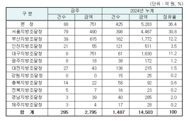 지역별 발주량을 보면 대전광역시 소재 본청 751억 원, 서울지방청 490억 원 등 2개청(1,241억 원)이 전체 금액(2,795억 원)의 44.4%를 차지하고 있으며, 인천 등 나머지 10개 지방청 1,554억 원이 각각 집행될 예정이다.