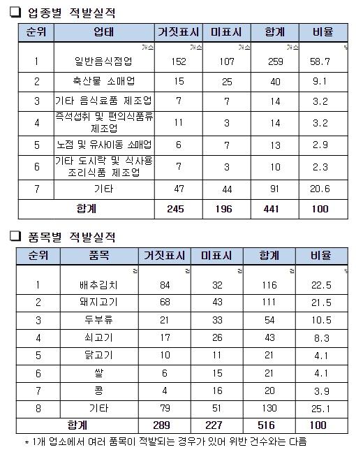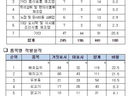 이번 일제점검 결과 위반품목은 배추김치(116건), 돼지고기(111), 두부류(54), 쇠고기(43), 닭고기(21), 쌀(21), 콩(20), 곶감(7) 순으로 많았으며, 위반업종은 일반음식점(259개소), 축산물 소매업(40), 음식료품 제조업(14), 즉석섭취 및 편의식품류 제조업(14), 노점 및 유사이동 소매업(13) 순으로 나타났다.