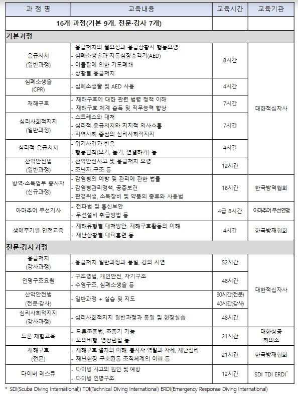 전문·강사과정인 응급처치 강사, 인명구조요원, 드론 운영, 다이버 등 7개 과정은 기본교육 과정을 이수한 단원들 위주로 선정하여, 해당 전문 교육기관의 교육일정 확인 후 개인별 일정에 맞춰 자율 이수 후 교육비를 지원하게 된다.