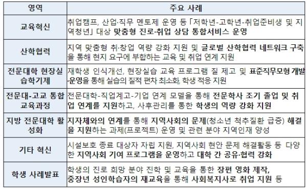 ‘전문대학 혁신지원사업’은 혁신 성장을 주도하는 창의적 현장실무인재 양성을 목표로 전문대학이 대학의 특성과 지역 수요를 반영하여 자율혁신 계획을 수립하고 추진할 수 있도록 지원하는 사업이다. 1주기 사업(2019~2022)에 이어 2주기 사업(2022~2024)이 진행되고 있는 본 사업은 전체 전문대학의 약 80%인 102개교가 참여하는 대표적인 전문대학 재정지원 사업으로 올해 6,179억 원을 지원한다.
