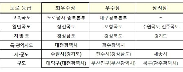도로 등급별 최우수 기관은 한국도로공사 충북본부(고속국도), 국토교통부 정선국토관리사무소(일반국도), 경상남도(지방도), 대전광역시(특·광역시도), 경기도 수원시(시·군도), 대전광역시 대덕구(구도)이다.