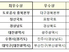 최우수상을 수상한 도로공사 충북본부는 도로포장, 정선국토관리사무소는 도로점용, 경상남도는 시설물 청결, 대전광역시는 배수시설 정비, 수원시는 안전시설 정비, 대덕구는 도로표지 관리 등에서 우수한 평가를 받았다.