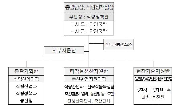 농식품부는 벼 재배면적 2만6천ha 감축을 목표로 '쌀 적정생산 대책'추진에 관한 사항을 총괄 지원하고, 농촌진흥청은 타작물 재배기술, 고품질 품종 개발 및 보급 등을 위해 노력하며, 농협경제지주는 콩?조사료 등 타작물 계약재배 및 안정적인 판로 등을 지원할 계획이다.
