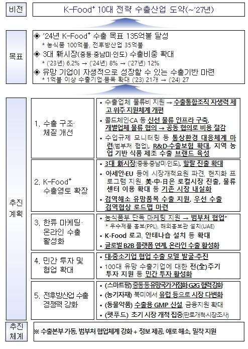 정부는 이번 대책에서 ‘10대 전략 수출산업으로 도약하는 K-Food ’를 비전으로 삼고, 올해 K-Food 135억불, ’27년까지 230억불을 수출 목표로 설정했다. 이번 대책은 지난해 'K-Food 수출확대 추진본부'를 운영하며 논의된 개선과제들과 현장의 의견을 기반으로 마련됐다