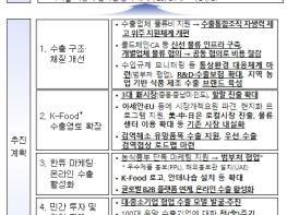 이번 대책은 K-Food 의 글로벌 경쟁력 제고에 중점을 두고 있다. 수출조직과 기업의 역량 강화에 중점을 두고 수출 지원체계를 개편함과 동시에, 투자 활성화 등 유망한 수출기업의 성장을 위한 기반을 마련하고, K-Food 수출 영토를 다각적으로 확장해나갈 계획이다.