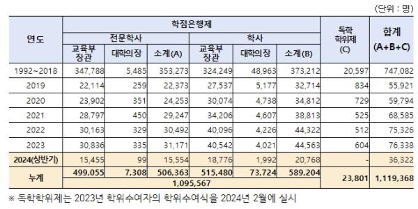 1990년(독학학위제), 1997년(학점은행제)부터 각 제도가 시작된 이래 성인 학습자에게 새로운 배움의 기회를 제공해 온 결과 누적 학위취득자가 2024년 기준 약 112만여 명(학점 1,095,567명, 독학 23,801명)에 이른다.