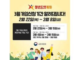 [중앙방송, 이은지기자] 청년도약계좌 3월 가입신청 기간은 2월 22일(목)~3월 8일(금)입니다!