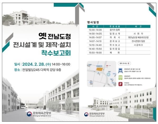 [중앙방송, 김혜영기자] 문화체육관광부 옛전남도청복원추진단은 2월 28일 오후 2시, 전일빌딩245 9층 대강당에서 ‘옛 전남도청 전시설계 및 제작?설치 착수보고회’를 개최한다.