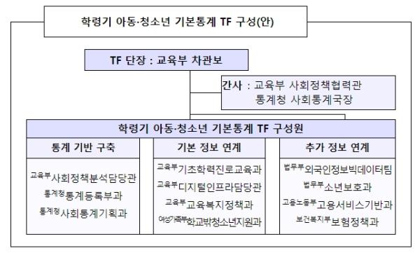 [중앙방송, 이온세기자] 교육부는 2월 28일 세종청사에서 통계청, 여성가족부 등 관계부처와 함께 ?학령기 아동·청소년 기본통계 작업반(TF)?을 출범하고 나주범 교육부 차관보 주재로 제1차 회의를 개최한다.
