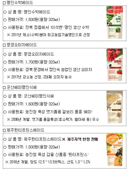 △달콤새콤 진한 감귤 맛 ‘제주윈터프린스에이드’= 농촌진흥청에서 육성한 만감류* 신품종 ‘윈터프린스’가 원료다. 윈터프린스는 껍질 벗기기가 쉬워 먹기 편하고 과즙이 풍부하다. 당도는 12.5~13.5브릭스, 산도 1.0~1.2%로 달콤하면서 새콤한 맛이 일품이다. 제주지역에서 한정 판매한다. 가격 1,500원(320㎖).
