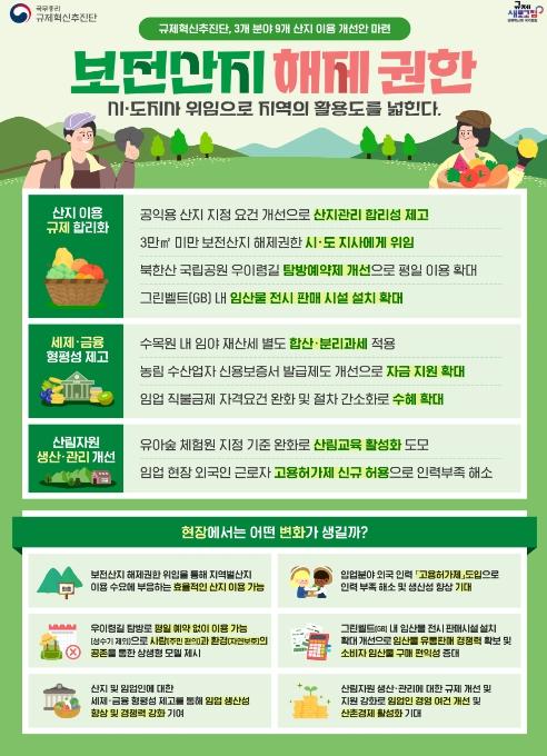 이번 규제 합리화는 여러 부처가 연계되어 풀기 어려운 덩어리규제를 개선한 것으로 산지 이용 및 산림산업 활성화를 위한 3개 분야* 9개 세부과제로 구성됐다.