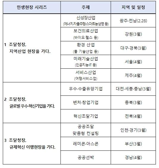 국민과 기업의 눈높이에 맞춰 경제활력 제고와 현장규제의 근원적 혁파를 모색하는 정책현장방문과 각계 전문가와의 현장간담회로 이뤄지는 이번 ‘민생현장소통’ 행보는 ▲지역산업, ▲글로벌 우수·혁신기업, ▲규제혁신 이행현장 등 세 가지 주제로 진행되며, 각 지역 산업 특성을 반영한 조달 정책과의 연계 및 성장지원 방안을 중점 논의한다.