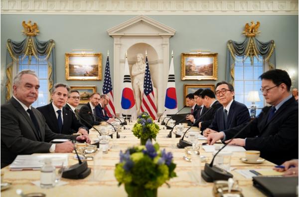 [중앙방송, 김정아기자] 미국을 방문중인 조태열 외교부장관은 2월 28일 오후(현지시간) 美 국무부 에서 안토니 블링컨(Antony J. Blinken) 국무장관과 취임 후 첫 한미 외교장관회담을 가졌다. 한미일 외교장관회의(2.22) 후 6일 만에 다시 만난 양 장관은 한미동맹·한미일 협력, 북핵?북한 문제, 정보협력, 지역?글로벌 현안 등에 대해 유익하고 심도깊은 논의를 했다.