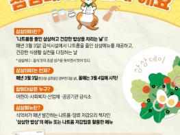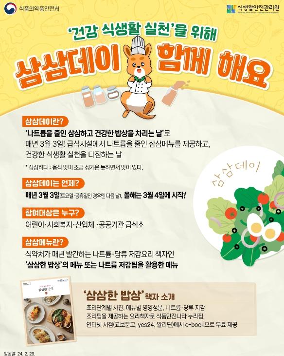‘삼삼데이’는 나트륨을 줄인 삼삼하고 건강한 밥상을 차리는 날이라는 의미로 올해 시범사업에는 8개 위탁급식업체가 운영하는 집단급식소 258개소와 식생활안전관리원이 급식 위생·안전관리를 지원하는 어린이급식소 약 35,500개소, 사회복지급식소 약 1,800개소가 참여한다.