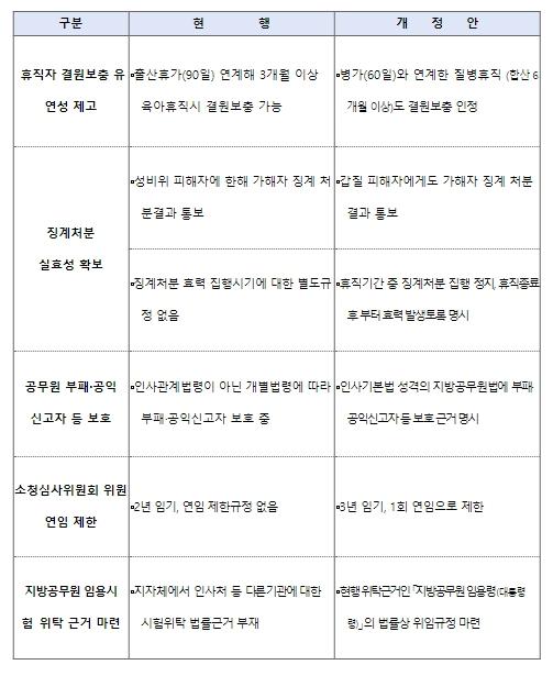 이 밖에도, 현행 대통령령으로 규정된 지방공무원 임용시험의 위탁 근거를 법률로 상향, 휴직기간 중에는 징계처분의 집행을 정지하는 등 인사 운영상 입법이 필요했던 부분도 함께 개선한다.