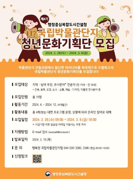 [중앙방송, 김혜영기자] 행복청은 국립박물관단지 건립 과정에서 국민의 요구를 반영하고, 정책 시행의 투명성과 공정성 강화 등을 위한 “제4기 국립박물관단지 청년문화기획단”을 모집한다고 밝혔다.