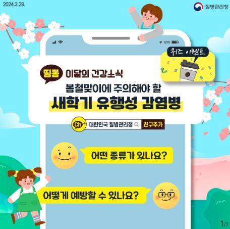 새학기 유행성 감염병에 대한 더 자세한 내용은 질병관리청 누리집에서,?매달 새로운 건강 지식을 알려주는 이달의 건강소식은 카카오톡 채널 ‘대한민국 질병관리청’을 추가하고 메시지로 받아보세요.