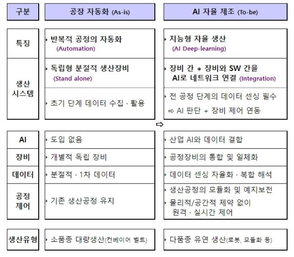 산업부는 주요 제조업의 공정을 분석하여 ?(지능형 생산) 디지털트윈 등 산업 데이터(Data)와 인공지능(AI)의 결합 시스템, ?(첨단장비 결합) 공정 단계별 생산장비의 일체화 및 Network 연결, ?(자율제조 시스템) 시스템 integration을 위한 소프트웨어(SW) 및 알고리즘 체계 등을 중심으로 핵심 요소를 식별하고 도입단계, 부처 간 협업 등을 담은 ?AI 자율 제조 마스터플랜?을 상반기 중으로 수립할 계획이다.