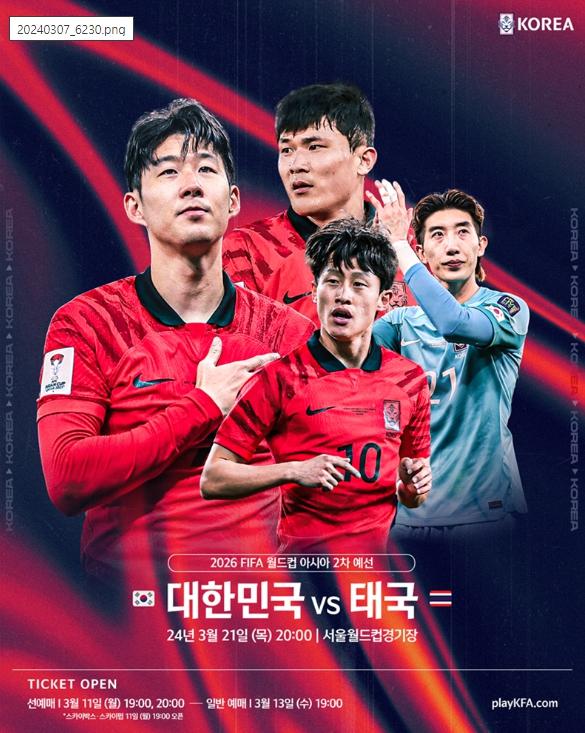 [중앙방송, 김지효기자] 대한축구협회는 오는 21일 서울월드컵경기장에서 열리는 북중미 월드컵 아시아 2차 예선 태국과의 홈경기 티켓을 11일부터 순차적으로 판매한다.