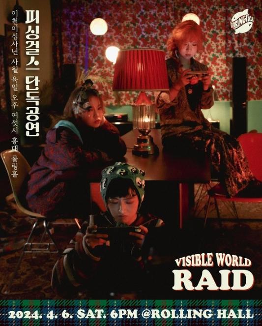 피싱걸스(보컬, 기타 비엔나핑거, 베이스 송쁘띠, 드럼 유유)는 오는 4월 6일 오후 6시 홍대 롤링홀에서 미니앨범 발매 기념 단독 공연 ‘Visible World: Raid(비저블 월드: 레이드)’를 개최한다.