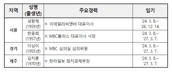 [중앙방송, 김영진 기자] 문화체육관광부 유인촌 장관은 언론중재위원회 중재위원의 임기 만료 및 사임에 따라 2024년 3월 8일 자로 중재위원 4명을 위촉한다. 위원의 임기는 위촉일로부터 3년이며, 사임한 위원의 후임자는 전임자의 남은 임기를 승계한다.