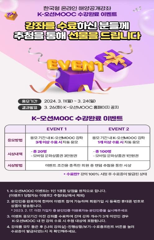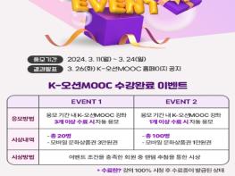 [중앙방송, 김혜영기자] 해양수산부는 누구나 무료로 바다를 주제로 한 강연을 들을 수 있는 온라인 공개강좌 누리집(K-오션MOOC)에 신규 강좌 업로드를 기념하여 3월 11일부터 수강자를 대상으로 이벤트를 개최한다. 3월 11일부터 3월 24일까지 총 14일간 강좌 1개 이상 수료자 중 추첨을 통해 모바일 기프티콘도 제공하며, 자세한 내용은 누리집을 통해 확인할 수 있다.