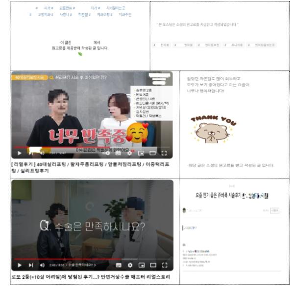 이번 모니터링은 ▲자발적인 후기를 가장한 치료경험담 ▲비급여 진료 비용을 할인하거나 면제하는 내용 ▲거짓된 내용 및 객관적인 사실을 과장하는 내용의 의료광고를 집중 점검했다.