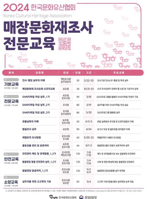 [중앙방송, 김혜영기자] 문화재청은 (사)한국문화유산협회(회장 김창억)와 함께 11월까지 매장유산 조사인력의 역량·전문성 및 안전의식 향상을 위하여 '2024년도 매장유산조사 분야 전문교육'을 시행한다. 교육 대상은 발굴조사기관, 박물관, 연구소 등에 재직하는 매장유산 조사인력을 비롯하여 관련학과 대학(원)생, 지자체·공공기관의 업무담당자 등이다.