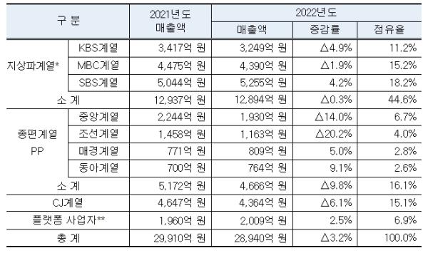 방송광고시장 규모의 감소는 사회적 거리두기 해제로 인한 방송 시청시간 감소, 콘텐츠 소비 행태 변화 등이 영향을 미쳤을 것으로 분석됐다. 사업자군 별로는 지상파방송 3사(계열PP 포함)의 방송광고 매출액이 1조 2,894억 원으로 전년 대비 0.3% 감소했고, 종편계열PP는 4,666억 원으로 전년 대비 9.8% 감소, CJ계열PP는 4,364억 원으로 6.1% 감소했다.