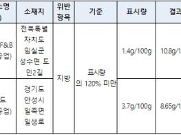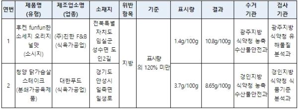 아울러 햄·소시지 등 영양성분 표시 제품 63건을 검사한 결과 2개의 제품에서 표시된 것보다 많은 양의 지방성분이 함유된 것이 확인되어 관할 지자체에 과태료 처분을 요청할 계획이다.