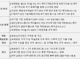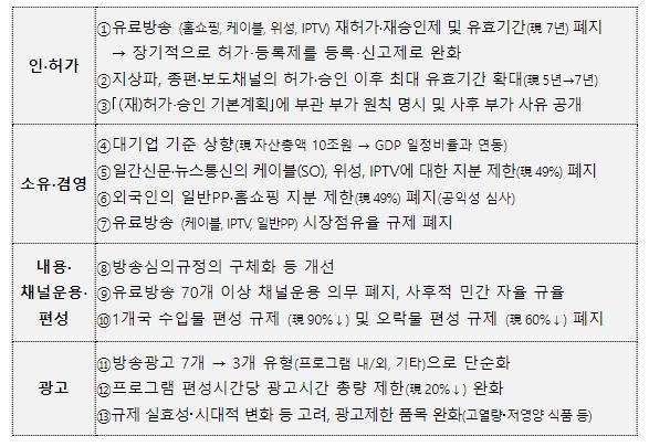 대표적으로 유료방송(홈쇼핑, 케이블, 위성, IPTV)의 재허가·재승인제를 폐지하고, 지상파방송 및 종편·보도 채널의 최대 유효기간을 확대(現 5년 → 7년)한다.