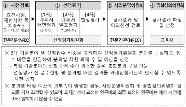 신청 대상은 장비를 도입·운영할 수 있는 공간과 조직을 갖춘 대학(4대 과기원 제외) 내 설치된 대학부설연구소, 핵심연구지원센터, 공동실험실습관이다. 선정평가위원회 등은 장비 구축의 필요성, 도입 여건 및 활용 역량, 구축 및 운영 계획의 타당성, 공동활용 및 자립화 계획 등을 평가하여 선정할 계획이다.
