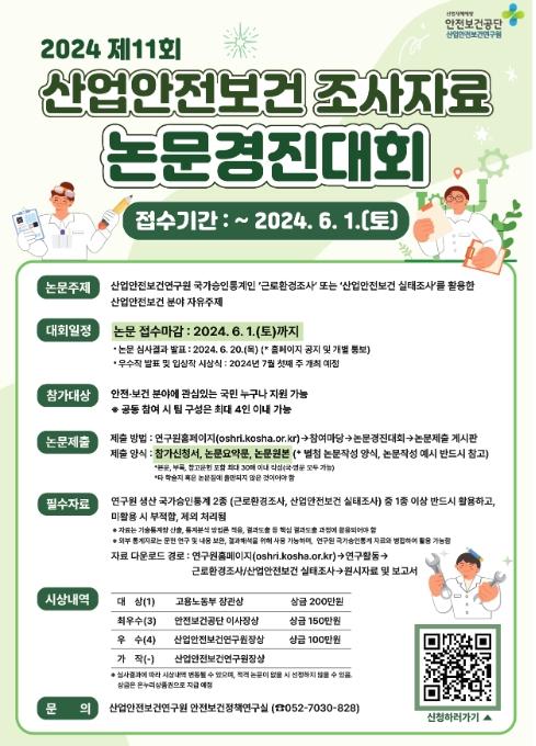 대한민국 국민이면 누구나 참여할 수 있으며, 산업안전보건 분야 자유주제의 논문 1편을 작성하여서 제출하면 된다. 연구원 누리집을 통해 6월 1일까지 논문을 제출할 수 있으며, 결과는 6월 20일 발표 예정이다.