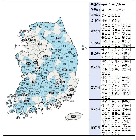 행정안전부는 인구감소지역을 체계적으로 지원하기 위해 2021년 89개 시군구를 인구감소지역으로 최초 지정·고시한 바 있다.