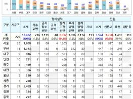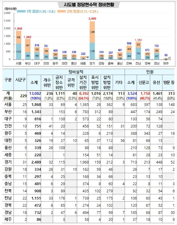 시도별 정비수량은 경기(2,489개), 서울(1,868개), 부산(1,343개), 전남(1,151개) 순으로 나타났고, 시지역?구지역 등 도시지역이 전체 정비수량의 86%(11,268개)를 차지하는 것으로 확인됐다.