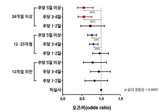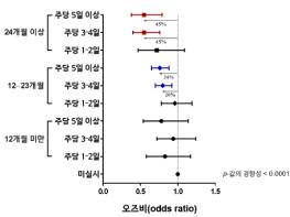 특히 저항성운동을 24개월 이상 지속한 경우에는 효과가 극대화되어, 주 3?4일 및 주 5일 이상 수행한 경우 모두 근감소증 위험이 각각 45%씩 감소했다.