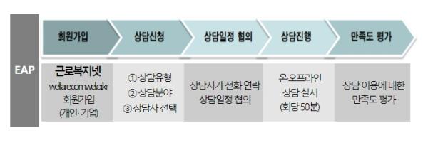 공단이 운영하는 근로자지원프로그램(EAP)은 근로자와 기업담당자가 근로복지넷 회원으로 가입하여 원하는 상담사 또는 프로그램을 신청하여 개인은 연 7회, 기업은 연 3회 한도 내에서 심리상담, 교육 서비스를 무상으로 이용할 수 있으며, 회원가입 없이 누구나 쉽게 조직 내에서 스트레스를 받는 심리상태를 확인할 수 있는 ‘스트레스 조직진단’이라는 심리진단 코너도 운영하고 있다.