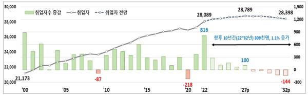 동 기간(2022년~2032년) 취업자 수는 30.9만명 증가하겠으며, 2027년까지는 증가를 지속하다가 2028년부터는 공급제약의 영향을 받아 감소 전환할 것으로 전망했다.