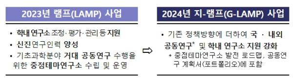 2024년에는 사업명을 ‘지-램프(G-LAMP)’로 변경하여 기존 사업에 더해 대학의 사업 운영의 자율성을 강화하고 세계적 수준의 글로벌 공동연구 수행 여건을 마련하는 데 집중한다.