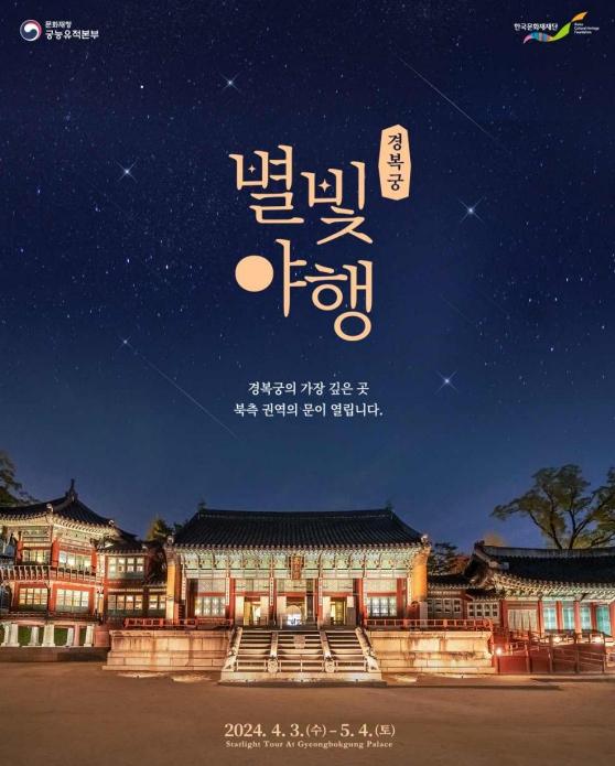 [중앙방송, 김혜영기자] 문화재청 궁능유적본부는 한국문화재재단(이사장 최영창)과 함께 경복궁 소주방에서 조선시대 궁중의식을 체험하고 경복궁 야경을 탐방하는 「2024 경복궁 별빛야행」 상반기 행사를 오는 4월 3일부터 5월 4일까지 매주 수~일요일에 하루 두 차례씩 개최한다. 온라인 입장권 예매는 3월 22일(1차 행사: 4.3.~4.21.)과 4월 12일(2차 행사: 4.24.~5.1.)에 나누어 진행된다.