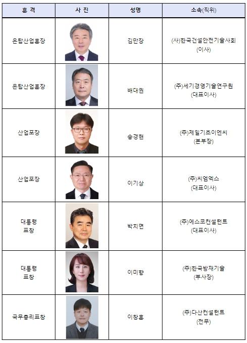 은탑산업훈장은 건설공사의 안전컨설팅과 안전진단 평가모델 구축 등 국내 건설안전 발전에 공헌한 김만장 (사)한국건설안전기술사회 이사와 난방에너지 절감과 층간소음문제 해결을 위한 연구개발 및 건설산업 품질경영체계 확립에 기여한 배대권 세기경영기술연구원 대표이사 등 2명에게 수여된다.
