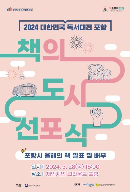[중앙방송, 김혜영기자] 국내 최대 독서 문화 축제인 ‘2024 대한민국 독서대전’의 개최지를 알리는 ‘2024 대한민국 책의 도시 선포식’이 3월 28일 오후 3시, 경상북도 포항시 ‘체인지업그라운드 포항’에서 열린다. 이번 행사에서는 포항시를 2024년 ‘책의 도시’로 선포하며, 상징기 전달과 함께 ‘2024 대한민국 독서대전’을 향한 항해를 시작한다.