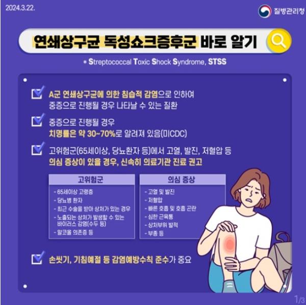 ※ 연쇄상구균 독성쇼크증후군은 국내에서는 법정감염병으로 분류하지는 않으나, △성홍열 합병증 환자 전수 역학조사 및 △급성 호흡기 환자 병원체 감시사업(실험실 병원체 표본감시, AriNet)을 통해 감시체계를 운영 중입니다!