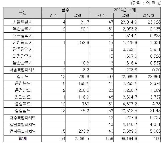 지역별로는 경기도 731억 원, 경상북도 730억 원, 인천광역시 353억 원, 그 밖의 지역이 882억 원이다.