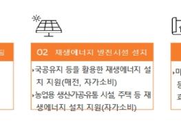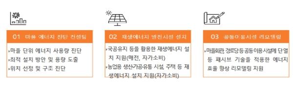 이 사업에 참여하는 농촌 마을은 ① 마을 에너지 사용량 진단 상담, ② 마을 유휴부지 등에 재생에너지 발전시설(마을발전소) 설치, ③ 주택, 농업 가공·유통 시설에 자가 소비용 재생에너지 발전시설 설치, ④ 경로당, 마을회관 같은 공동이용시설의 단열·창호 개선 등을 통해 낭비되는 에너지를 줄이는 에너지 효율 개선 등을 2년간 종합적으로 지원받게 된다.